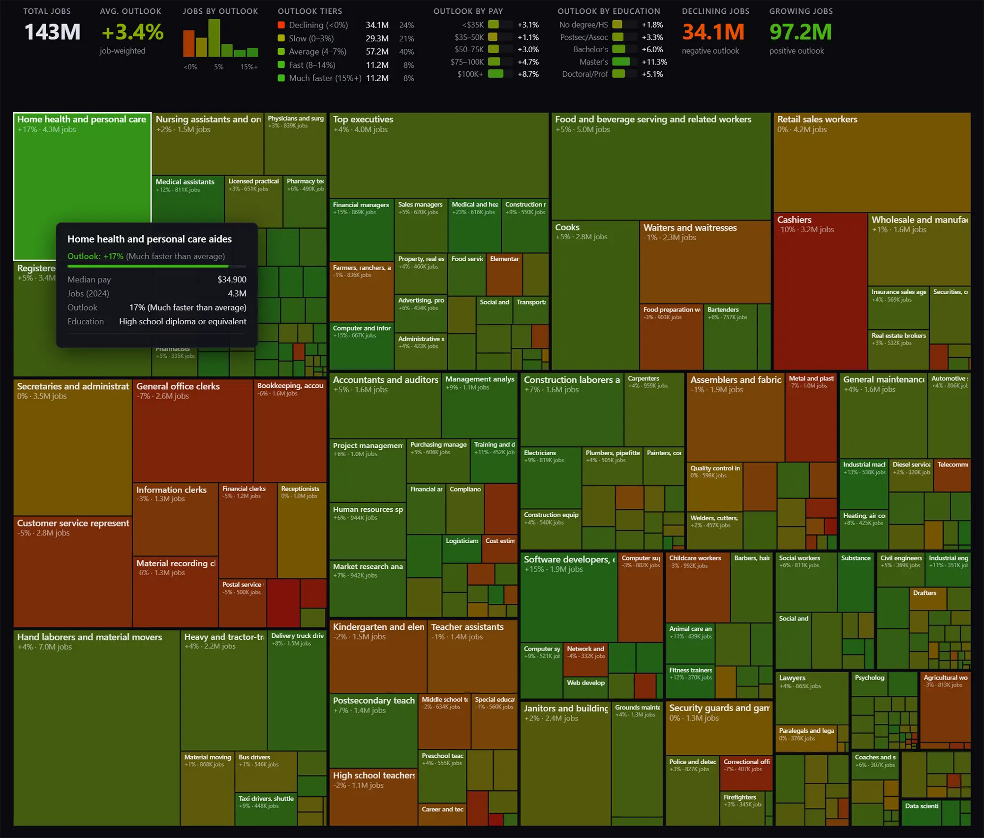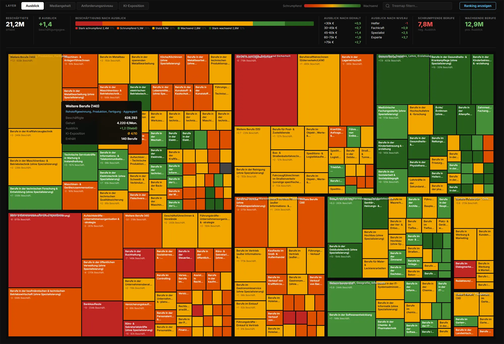 Die Plattform ordnet die verschiedenen Berufsfelder in einer interaktiven Treemap an. Interessierte erkennen dort auf einen Blick das jeweilige Median-Bruttogehalt sowie die Stärke der potenziellen KI-Auswirkungen auf die Tätigkeiten.