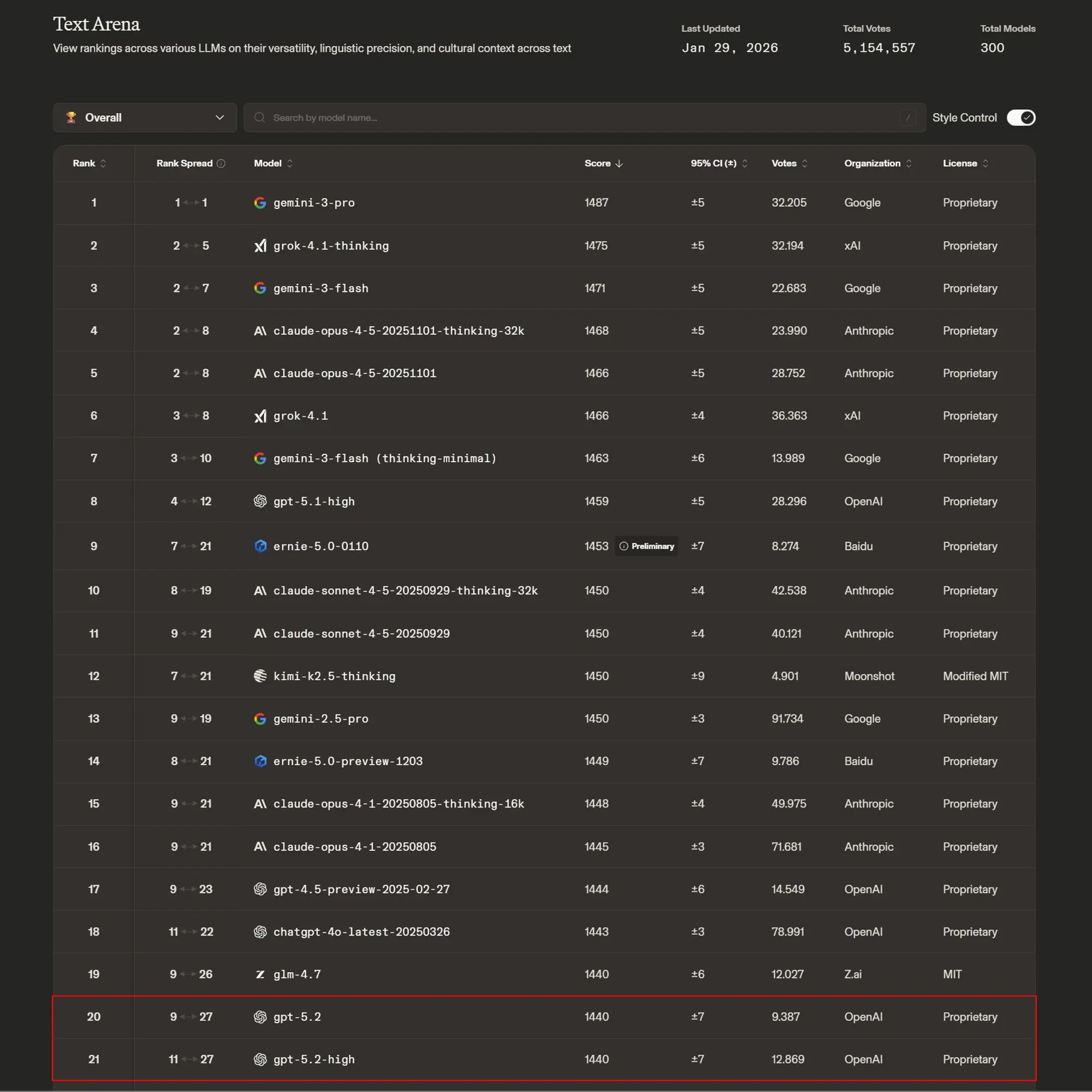Die Realität im Jahr 2026 lässt sich in harten Zahlen ausdrücken, und die sind für den einstigen Marktführer erschreckend. Im Bereich "Writing", der Paradedisziplin eines Sprachmodells, rangiert das aktuelle Flaggschiff GPT-5.2 auf den gängigen Leaderboards nur noch auf Platz 20. Was früher der Goldstandard für Texte war, ist heute graues Mittelmaß.