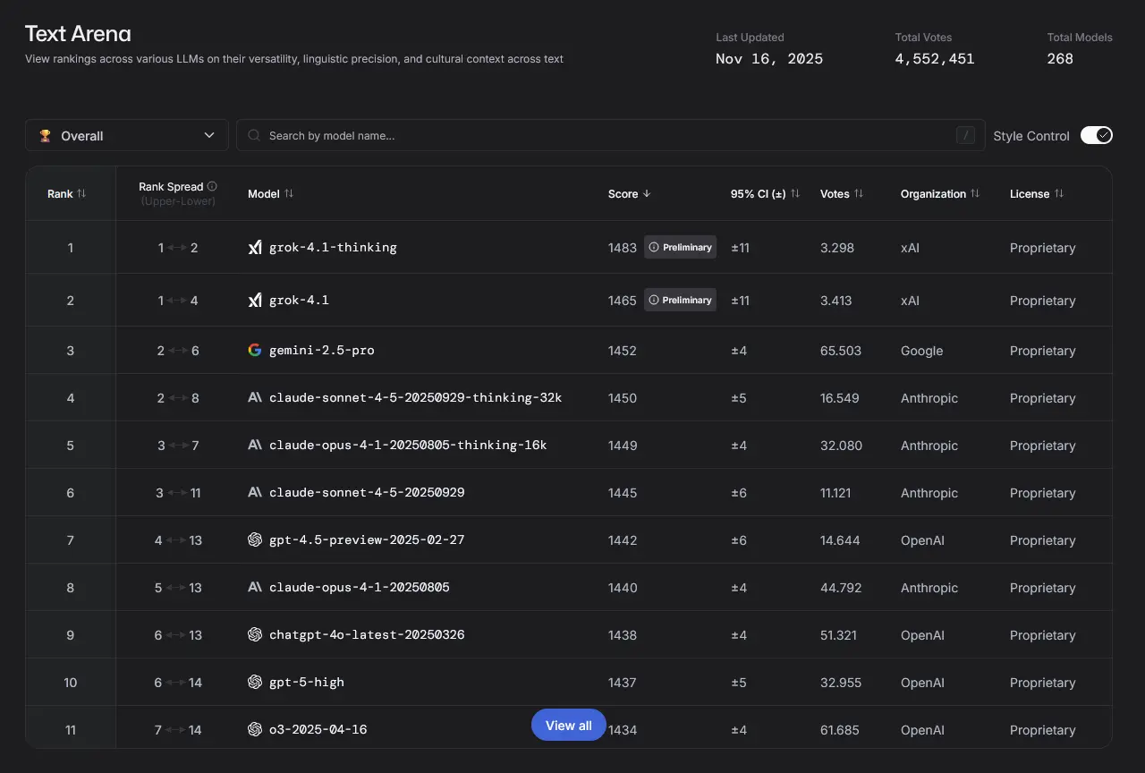 Die unabhängige Plattform LMArena gilt als wichtiger Gradmesser für die tatsächliche Leistungsfähigkeit von Sprachmodellen im Alltag. Hier sorgt Grok 4.1 aktuell für Aufsehen. Das Modell sichert sich den ersten Platz im "Text Arena Leaderboard". Mit einem Elo-Score von 1483 im sogenannten Thinking-Modus übertrifft die Software bisherige Spitzenreiter spürbar.