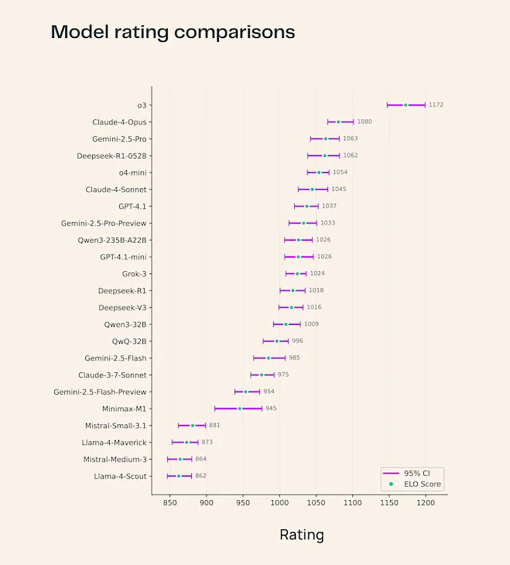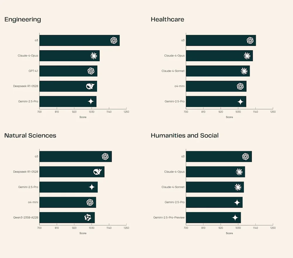 Im ersten Durchlauf dominiert OpenAIs neues Modell o3 das Ranking. Dicht dahinter liegen Claude‑4‑Opus und Gemini 2.5‑Pro – alle drei proprietär, mächtig, aber geschlossen. Spannend ist allerdings, wie gut sich Open-Source-Modelle schlagen. DeepSeek‑R1‑0528 landet in den Top 5 und lässt teils etablierte Namen hinter sich. Das Modell punktet vor allem in Technik- und Naturwissenschaften mit fundierten, gut belegten Antworten.