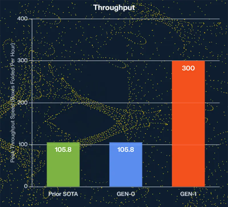 GEN-1 löst eine zentrale Herausforderung der Robotik: die langsame Ausführung von Aufgaben. Das KI-Modell agiert im Durchschnitt dreimal schneller als bisherige Spitzenreiter. Für das Falten eines Kartons benötigt das Modell beispielsweise lediglich 12,1 Sekunden. Das Vorgängermodell GEN-0 brauchte für denselben Vorgang noch rund 34 Sekunden.