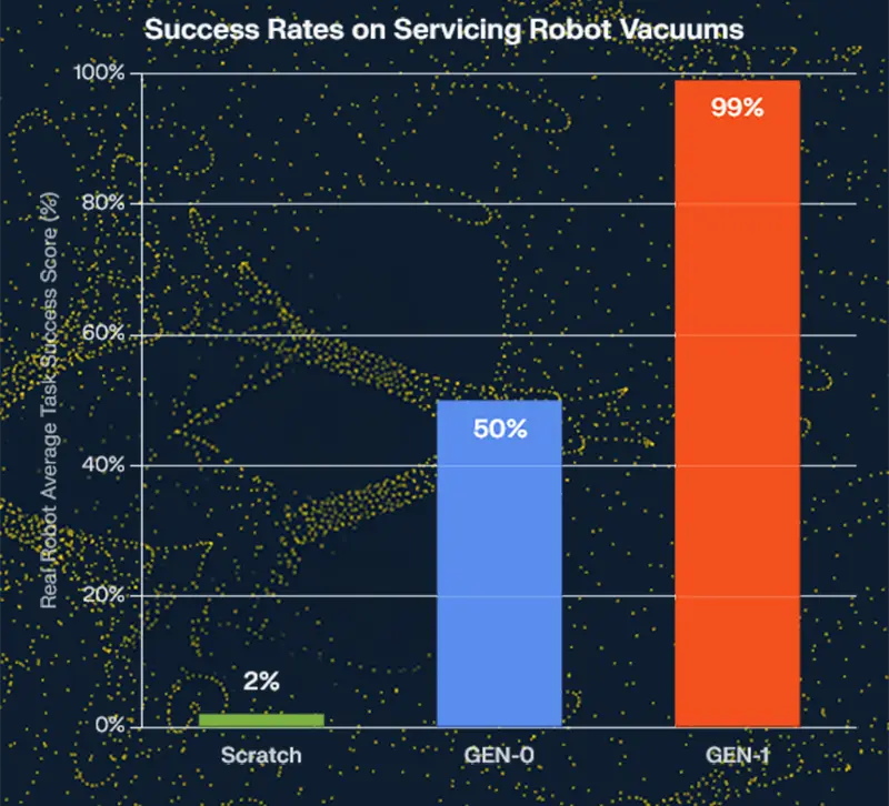 Gleichzeitig steigt die Zuverlässigkeit der Modelle deutlich. Bei filigranen Tätigkeiten wie dem Verpacken von Smartphones oder der Wartung von Saugrobotern erzielt GEN-1 konsistent Erfolgsquoten von 99 Prozent. Zum Vergleich lieferte der Vorgänger bei ähnlichen Arbeiten eine durchschnittliche Rate von 64 bzw.50 Prozent. Ohne vorheriges Pre-Training scheitern unvorbereitete Modelle meist sogar komplett.