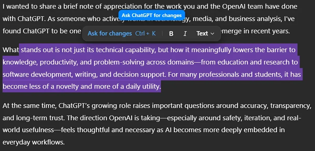 Dies markiert einen strategischen Wechsel in der UX-Philosophie von OpenAI. Weg vom reinen Dialog, hin zum Dokumenten-Editor. Die Kombination aus einer neuen Plattform-Struktur (Sonata) und erweiterten Bearbeitungswerkzeugen (Salute) suggeriert, dass OpenAI die reine Chat-Metapher aufbricht. Das Ziel ist offenbar eine Arbeitsumgebung, in der die KI eher als Co-Autor in einem Editor fungiert und weniger als reiner Gesprächspartner.