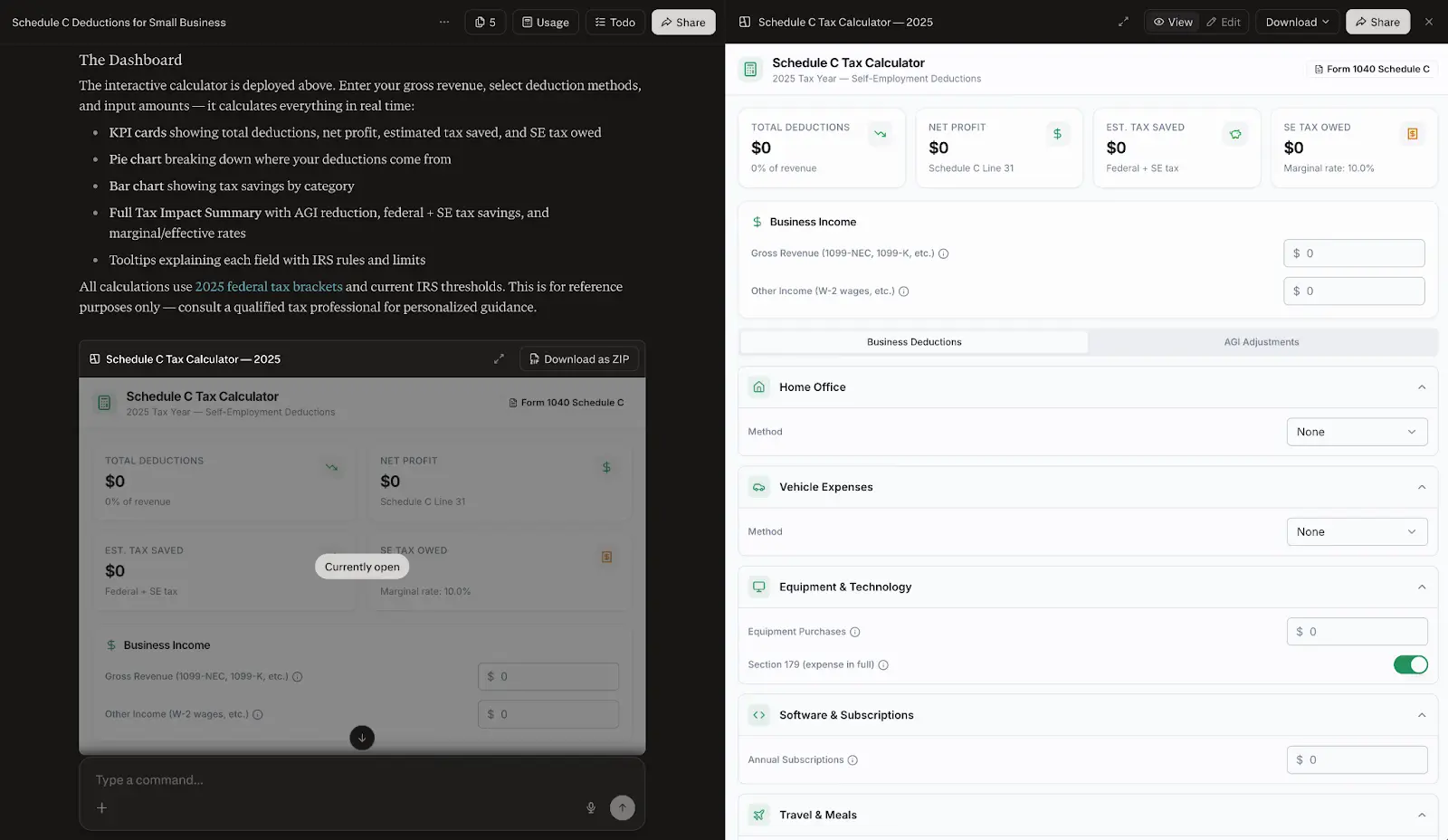 Neben dem bloßen Ausfüllen generiert das Modell interaktive Dashboards und Tabellenkalkulationen. Anwender erhalten beispielsweise einen detaillierten Steuerrechner für selbstständige Tätigkeiten, der Nettoerträge und Steuerersparnisse visuell aufbereitet. Solche dynamischen Ansichten helfen bei der Planung von Abschreibungen für Geschäftsausstattung oder bei der Verwaltung von passiven Verlusten über ein Portfolio von Mietobjekten hinweg.