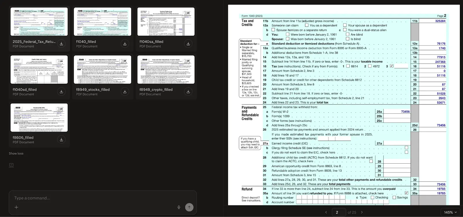 Die KI unterstützt Anwender tiefgreifend bei der Ausarbeitung der Steuerunterlagen. Sie analysiert die finanzielle Situation der steuerpflichtigen Person und überträgt die ermittelten Werte präzise in offizielle Dokumente wie das Form 1040. Auch spezielle Anlageblätter für Kapitalerträge oder Transaktionen mit Kryptowährungen verarbeitet das System direkt.