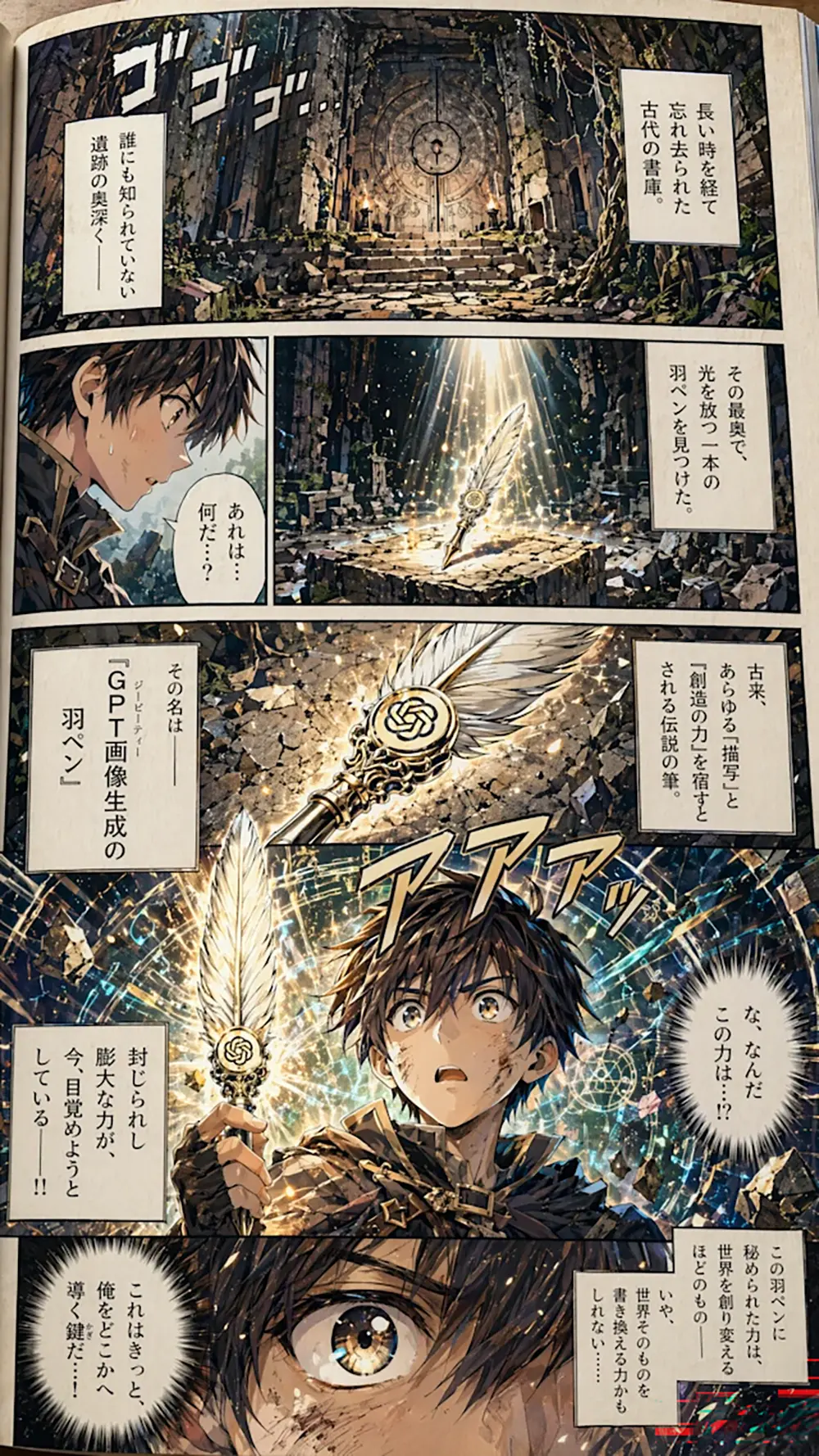 Make a sample page of a colorized Japanese shonen adventure manga. The page should vividly depict our main character found a magical quill. The name of the quill is called the Quill of GPT Image. Make it dramatic. The magical quill has strong power sealed inside it. Additional instructions: Aspect ratio: Portrait 1440x2560. The pen should have an OpenAI logo on it. The language throughout the manga should be Japanese. Think carefully first to make this a good story with good split of manga panels. The page should appear as a photo of a physical page, not a digital page.
