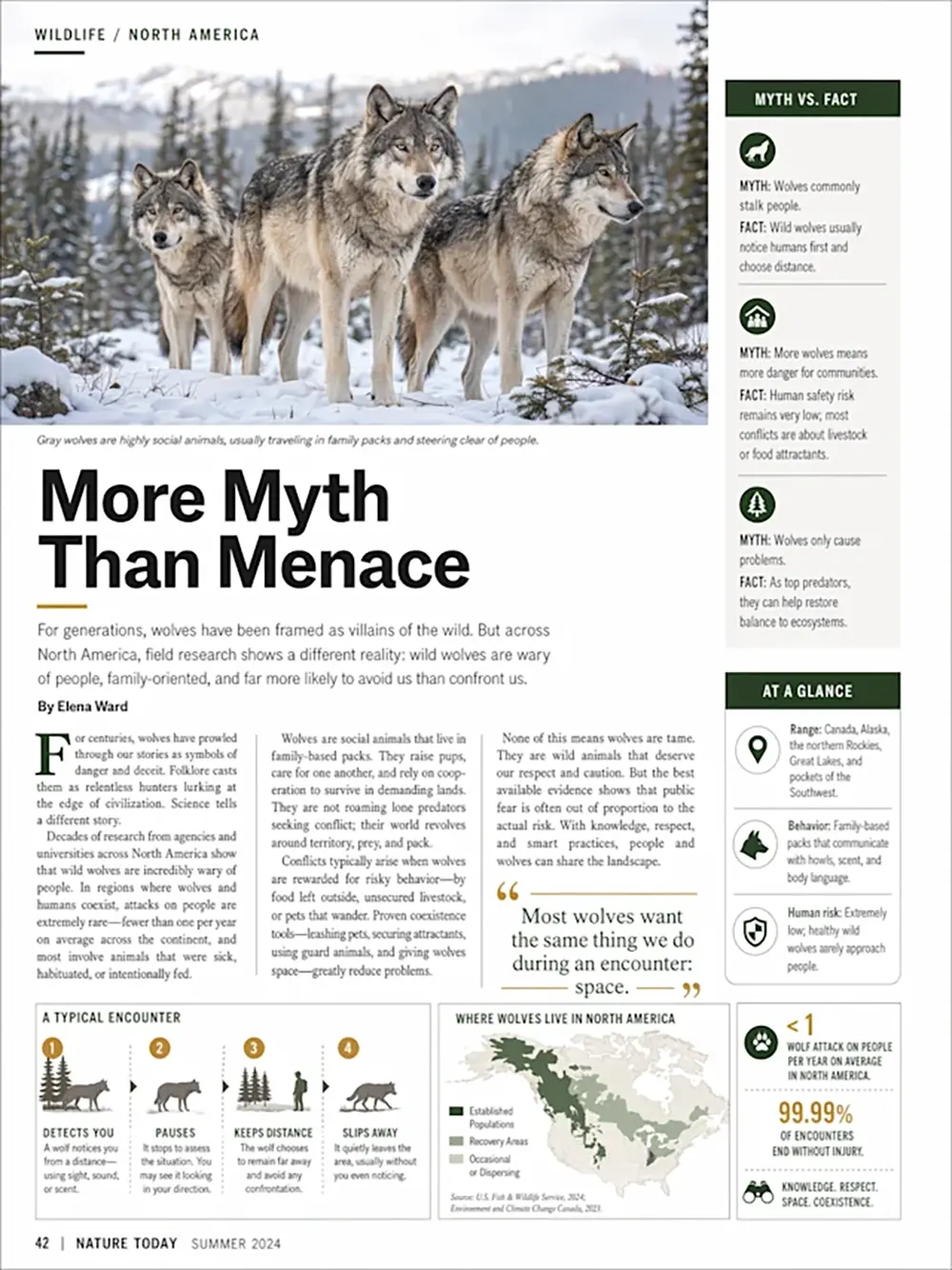 an editorial magazine page about wolves in north america and how they're more harmless than we think. make it look like a glossy, smooth, well laid out widely distributed science magazine.