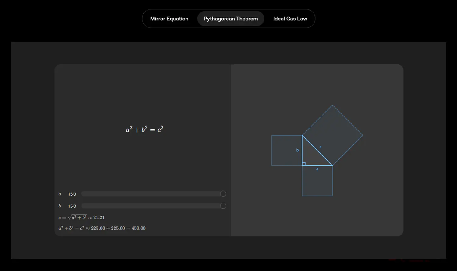 Dabei greift die KI auf ein festes Repertoire zu. Fragen nach dem Satz des Pythagoras, der Linsengleichung oder dem idealen Gasgesetz beantwortet das System nicht mehr nur mit einer reinen Definition. Stattdessen erscheint ein visuelles Objekt, bei dem Anwender die Eingabewerte über integrierte Regler gezielt verändern können.
