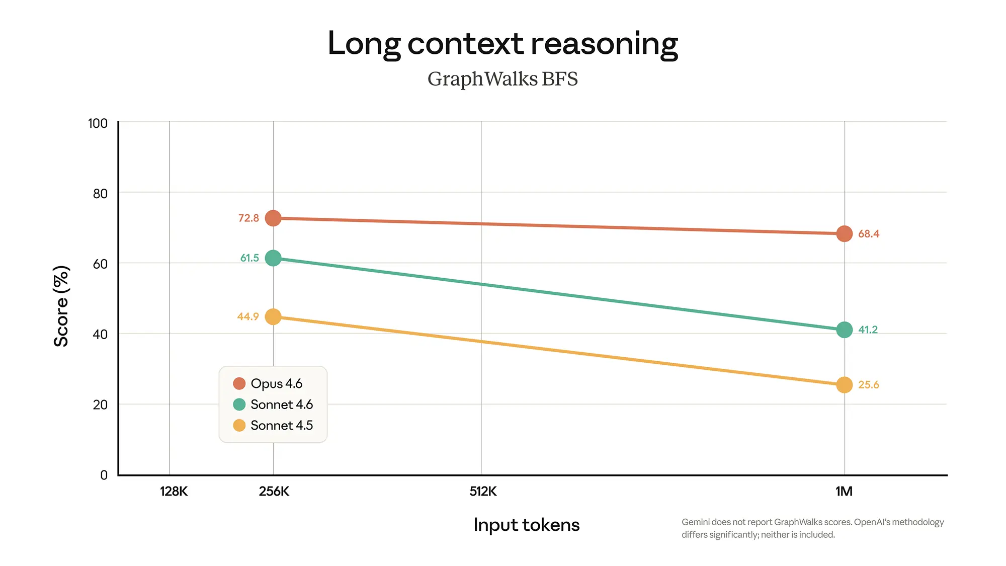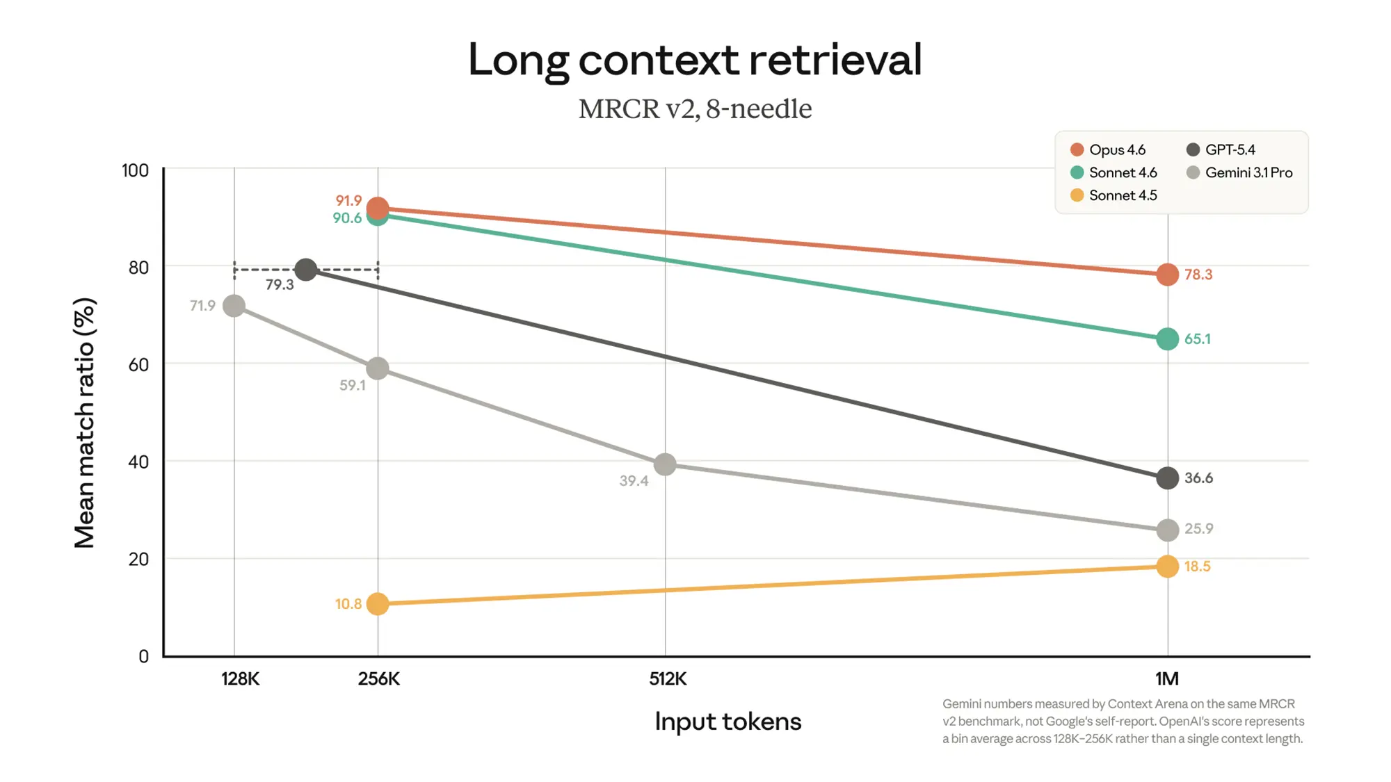 Beim Test zur exakten Informationsabfrage (Long Context Retrieval) erreicht das Top-Modell Opus 4.6 bei einem Kontext von 256.000 Token eine Trefferquote von knapp 92 Prozent. Reizt man das Fenster komplett auf eine Million Token aus, sinkt dieser Wert nur leicht auf 78,3 Prozent. Das schnellere Modell Sonnet 4.6 hält bei voller Auslastung noch einen soliden Wert von 65,1 Prozent.