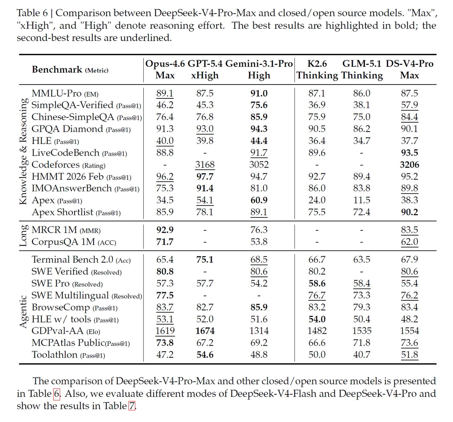 Für lange Kontexte liefert DeepSeek dagegen ein starkes Profil. In MRCR 1M erreicht V4-Pro-Max 83,5 Punkte und liegt vor Gemini-3.1-Pro, aber hinter Claude Opus 4.6. In CorpusQA 1M kommt DeepSeek auf 62,0 Punkte, vor Gemini mit 53,8 und hinter Claude mit 71,7.