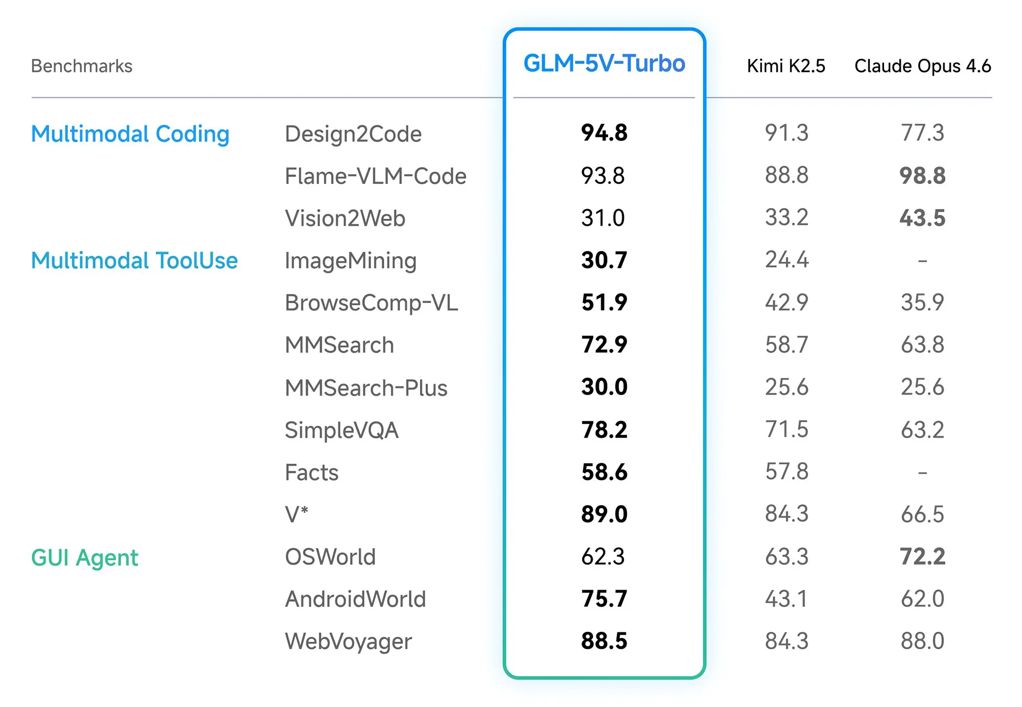In den Benchmarks dominiert das Modell besonders im Bereich Multimodal Coding. Beim Testlauf Design2Code erzielt GLM-5V-Turbo starke 94,8 Punkte und verweist das Konkurrenzmodell Claude Opus 4.6 auf die hinteren Plätze. Im klassischen textbasierten Backend-Coding offenbart das System allerdings noch Schwächen gegenüber der Top-Riege.