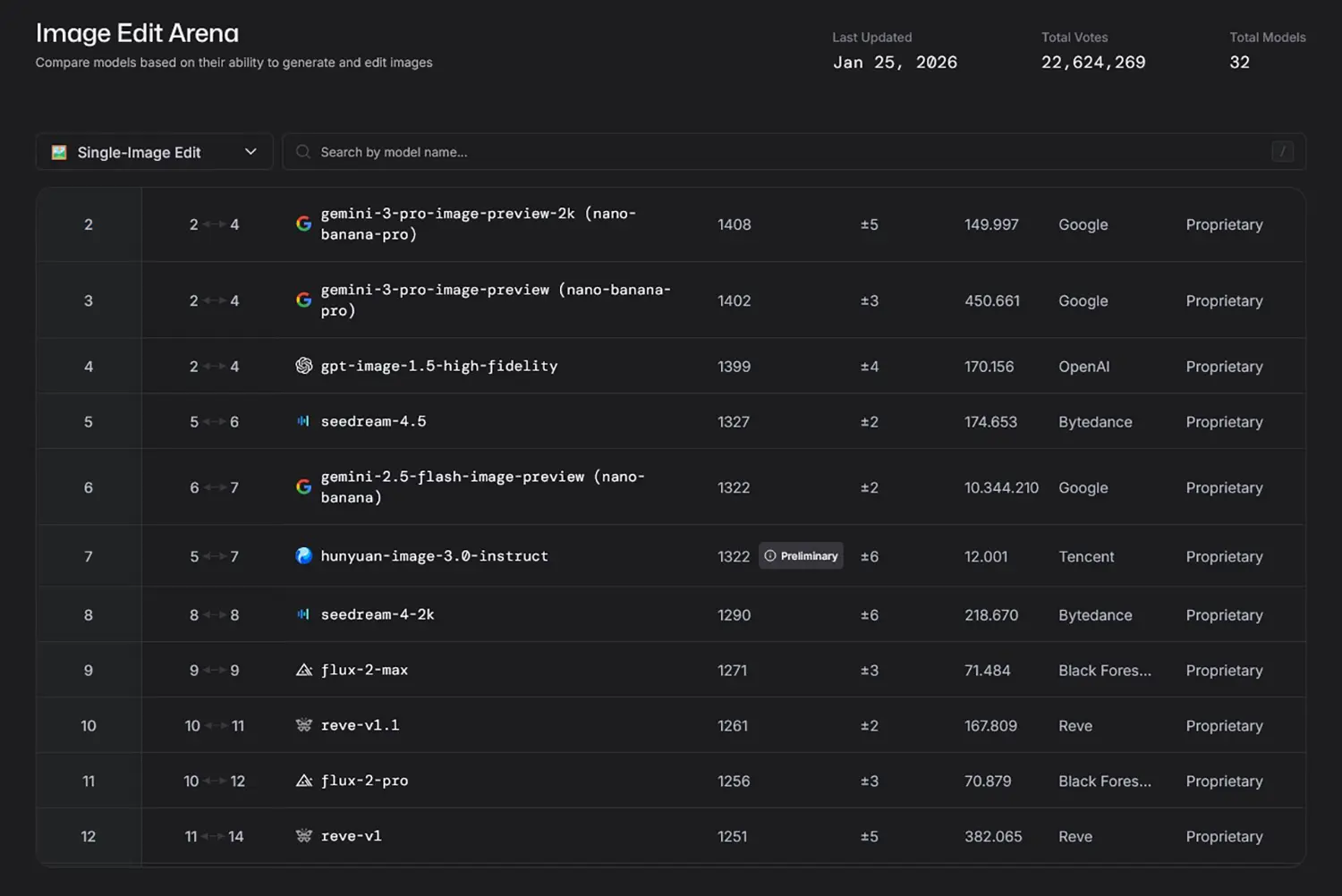 Das Kräftemessen der Bild-KIs hat einen neuen Teilnehmer. In der renommierten "Image Edit Arena", einer Plattform zum blinden Vergleich von KI-Modellen, ist HunyuanImage 3.0-Instruct direkt auf Platz 7 eingestiegen. Mit einem Elo-Score von 1322 Punkten zieht das Modell gleich mit Googles "Gemini 2.5 Flash". Dies ist ein beachtlicher Einstand für das chinesische Modell, da es sich damit sofort im oberen Bereich der "Proprietary"-Klasse etabliert.