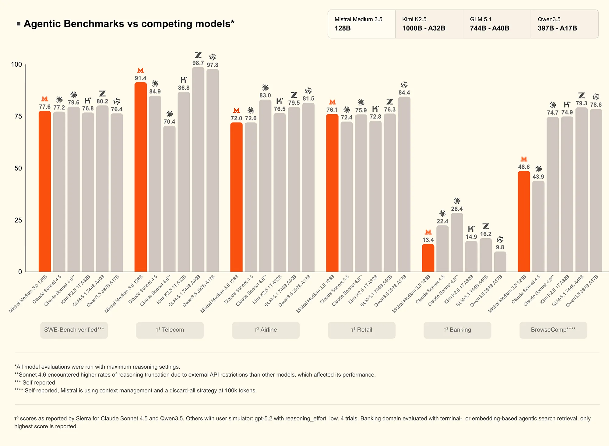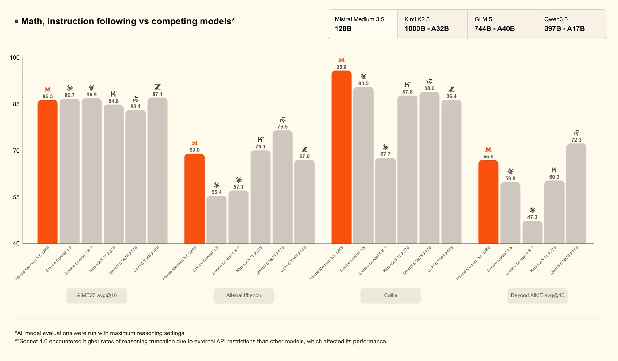 Besonders in direkten Vergleichen zeigt die neue Architektur starke Ergebnisse. Bei den Agentic Benchmarks erreicht Mistral Medium 3.5 im SWE-Bench Verified 77,6 Prozent. Damit übertrifft es nicht nur den internen Vorgänger Devstral 2 mit seinen 72,2 Prozent, sondern setzt sich auch knapp vor konkurrierende KI-Modelle wie Claude Sonnet 4.5, das 77,2 Prozent erzielt. Im branchenspezifischen τ³-Telecom-Test liefert das System 91,4 Punkte. Auch komplexe mathematische Aufgaben löst das Modell äußerst verlässlich. Beim AIME25 avg@16 Benchmark verzeichnet die Neuentwicklung 86,3 Punkte und schlägt damit Architekturen wie Kimi K2.5 sowie Qwen3.5.