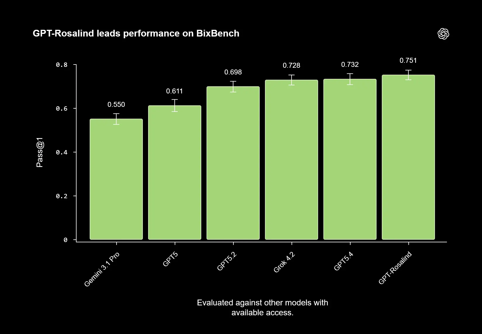 Hier verdoppelt GPT-Rosalind den erreichten Score im Vergleich zum direkten Vorgänger beinahe. Auch im unabhängigen BixBench-Test, der bioinformatische Aufgaben prüft, setzt sich das spezialisierte KI-Modell souverän an die Spitze.