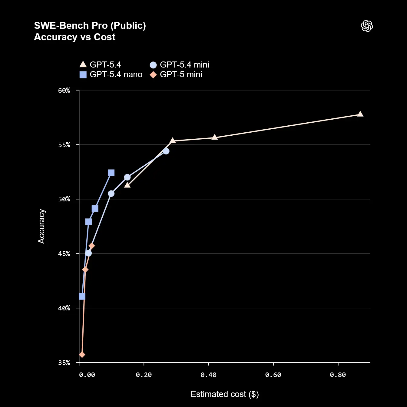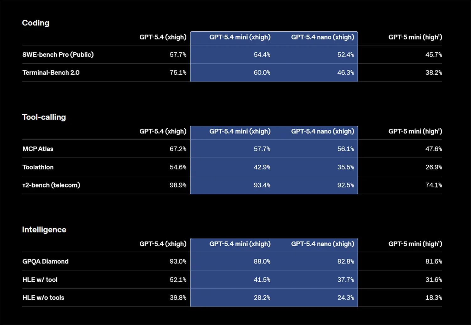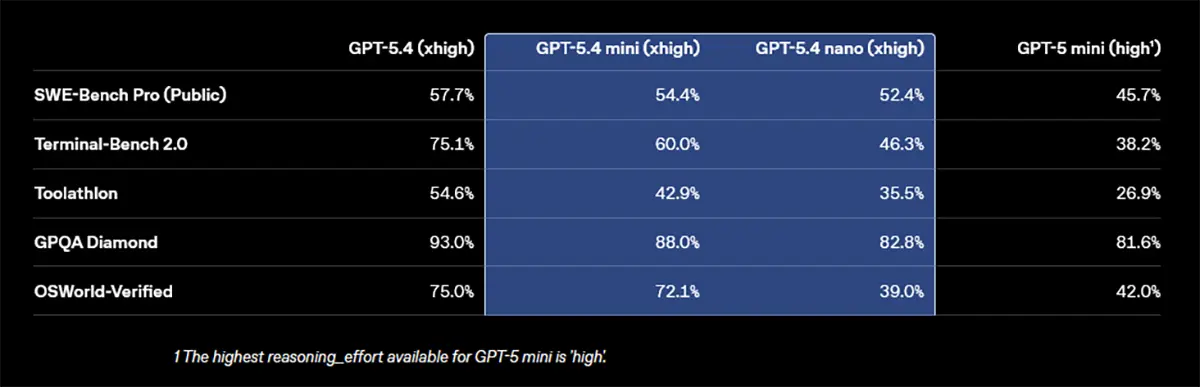 Die aktuellen Benchmarks stützen diese neue Ausrichtung. Bei der Softwareentwicklung (SWE-bench Pro) erreicht GPT-5.4 mini 54,4 %. Das kompaktere nano-Modell kommt auf 52,4 %.