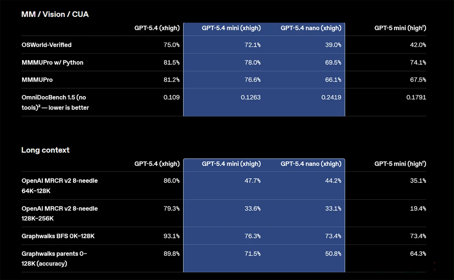 Auch bei der visuellen Steuerung von Computern punktet das Update. Im OSWorld-Verified Benchmark erzielt das mini-Modell 72,1 %. Es liegt damit fast gleichauf mit dem großen Flaggschiff GPT-5.4, das 75,0 % erreicht. Bei dieser rein visuellen Aufgabe zeigt das kleine nano-Modell mit 39,0 % allerdings noch Schwächen.