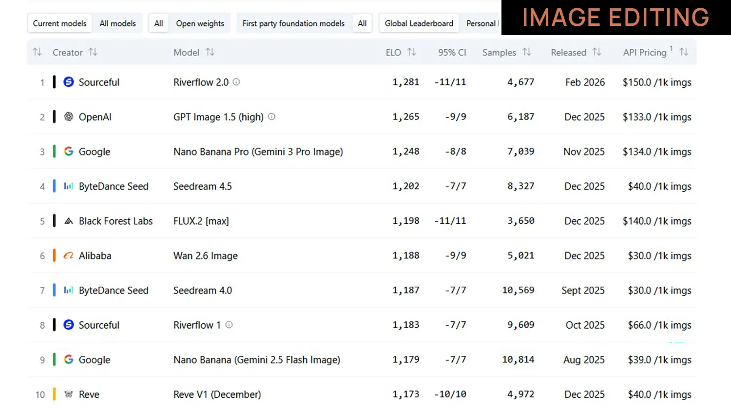 Sourceful übernimmt mit Riverflow 2.0 überraschend die Führung in den weltweit beachteten Artificial Analysis Leaderboards. Das im Februar 2026 veröffentlichte Modell setzt sich sowohl bei beim erstellen von Bildern als auch bei der komplexen Bildbearbeitung gegen etablierte Größen wie GPT Image 1.5 und Googles Nano Banana Pro durch.