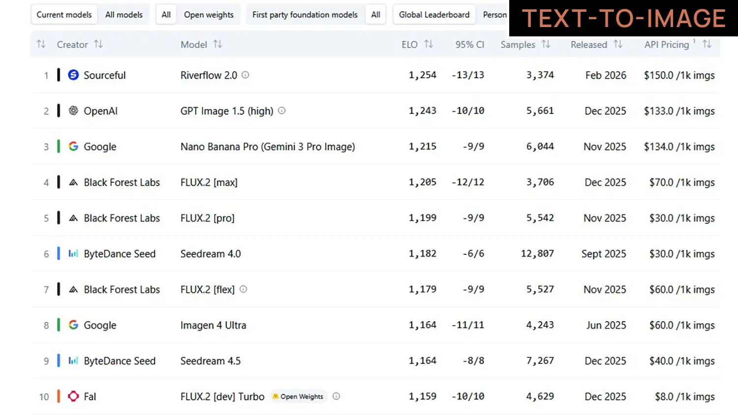 Die unabhängige Analyseplattform Artificial Analysis führt Riverflow 2.0 seit heute auf Platz 1 in den zwei wichtigsten Kategorien für bildgebende KI. Im Bereich "Text-to-Image" erreicht das Modell einen ELO-Score von 1.253 und verweist damit OpenAIs GPT Image 1.5 (High) sowie Googles "Nano Banana Pro" auf die Plätze.