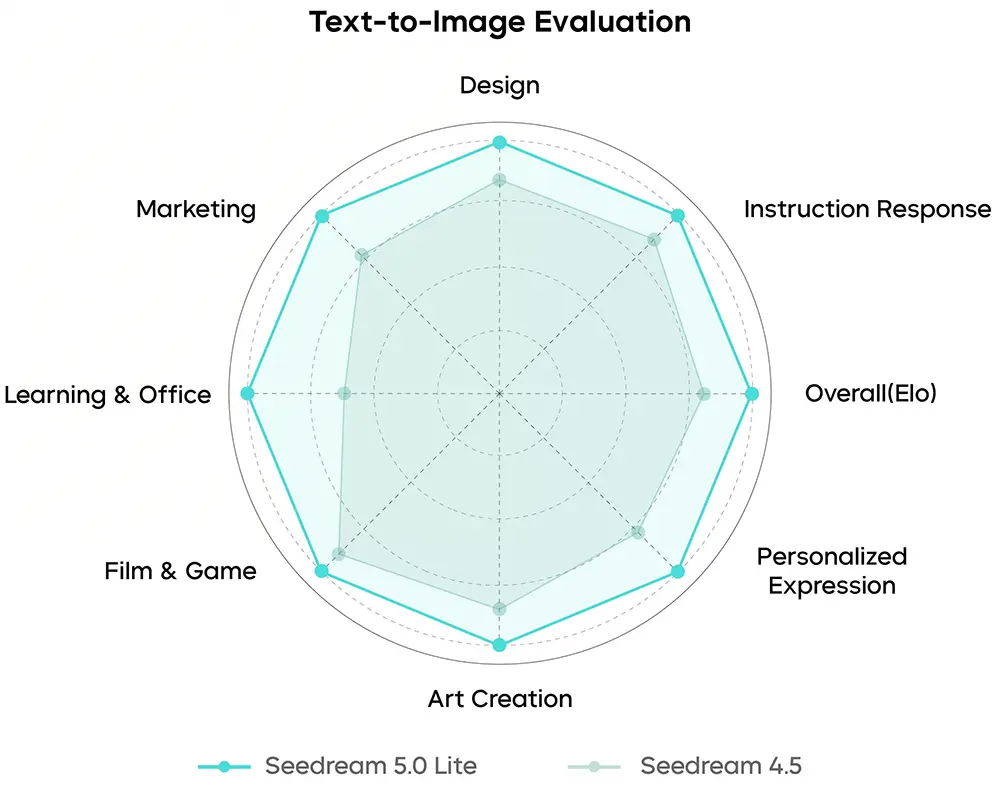 Die vom Hersteller veröffentlichten Radar-Diagramme zeigen messbare Leistungssteigerungen gegenüber der Vorgängerversion 4.5. Bereits dieses ältere Modell belegte in gängigen Ranglisten für die Text-zu-Bild-Generierung und Bildbearbeitung vordere Plätze. Die aktuellen Auswertungen weisen nun über alle Testdisziplinen hinweg einen höheren Gesamtwert (Overall Elo) auf. Besonders deutliche Verbesserungen verzeichnet Seedream 5.0 Lite in den Kategorien Wissensabruf ("Knowledge & Reasoning") und bei der exakten Befehlsumsetzung ("Instruction Response").