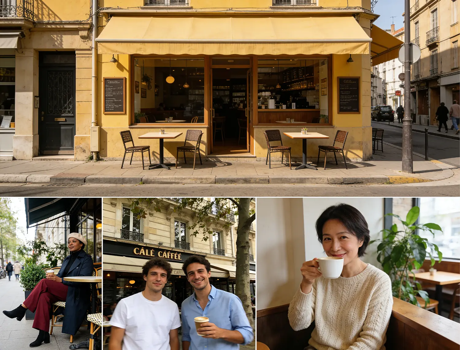 A claymation-style café advertisement scene. Multiple tables in a cozy café, each with two clay figures sitting, drinking coffee, talking, and laughing animatedly. The entire scene has the handmade, textured look and feel of clay animation, like a warm, inviting commercial.
