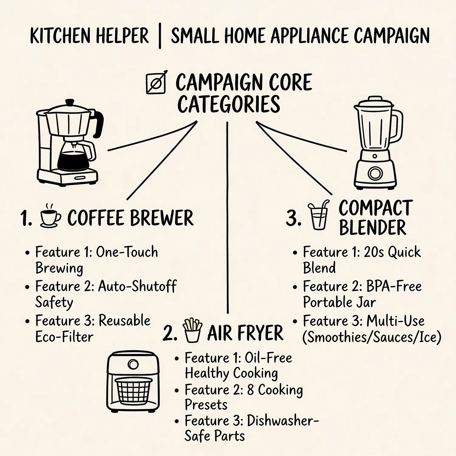 A professional-looking mind map for a 'Kitchen Helper' campaign for small home appliances. The central node is 'Kitchen Helper Campaign'. Branching out are three main categories with hand-drawn icons: 'Cooking Appliances', 'Beverage Makers', and 'Food Prep Tools'. Each category has three sub-branches listing key product features (e.g., Cooking Appliances: Precise Control, Versatile Functions, Easy Clean-up). The entire mind map is well-organized, clean, and visually appealing.