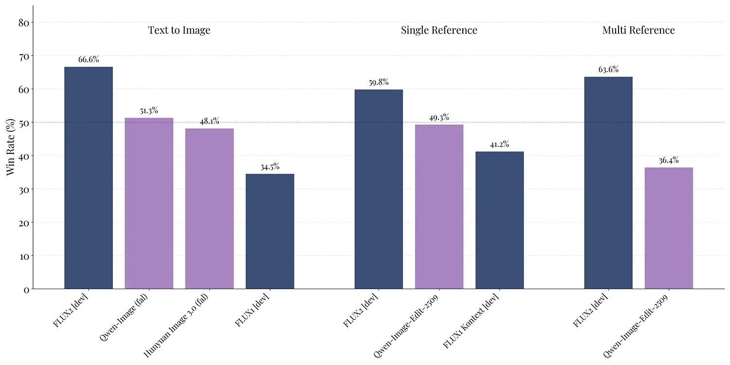Ein Blick auf die aktuellen Benchmarks offenbart die spannende Marktpositionierung des neuen Modells. Im direkten Vergleich der Bildqualität (ELO-Score) spielt FLUX.2 [pro] in der absoluten Oberliga und muss sich lediglich dem Modell "Nano Banana 2" knapp geschlagen geben. In Blindtests (Win Rate) lässt besonders die [dev]-Variante etablierte Konkurrenten wie Qwen-Image oder Hunyuan deutlich hinter sich.