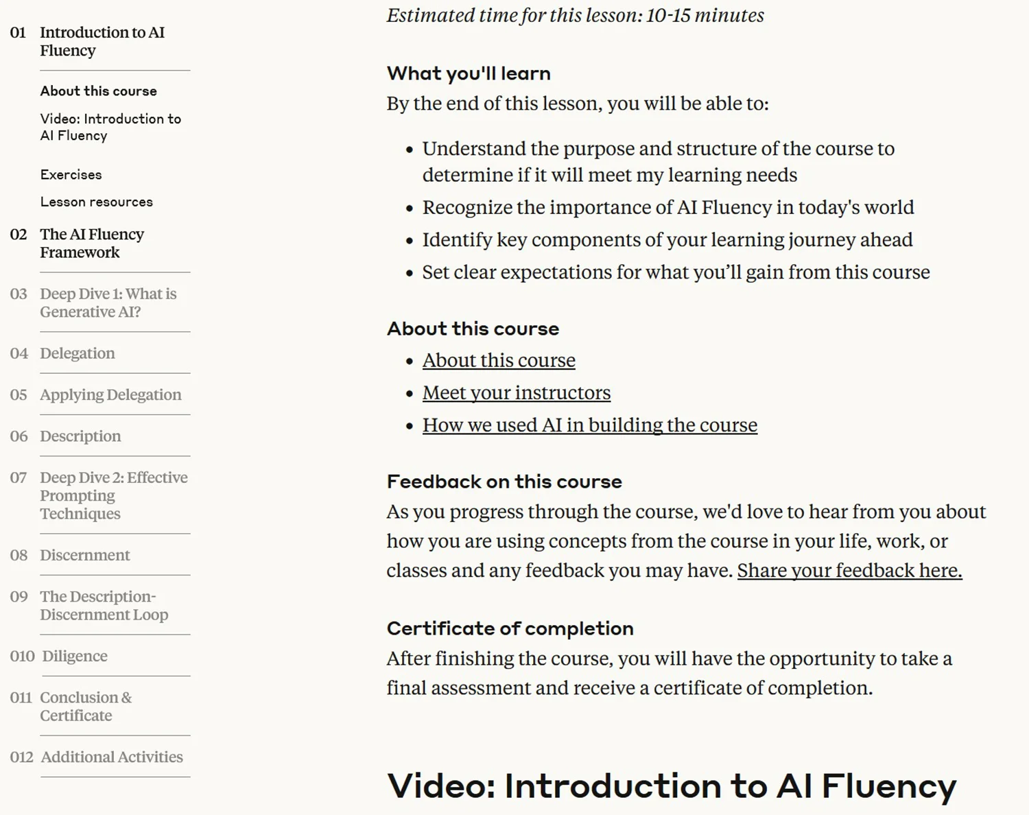 Der Kurs gliedert sich in zwölf kompakte Lektionen, die in etwa drei bis vier Stunden durchlaufen werden können. Er beginnt mit einer Einführung in das Konzept der KI-Fluency und erklärt, warum diese Fähigkeit immer wichtiger wird. Im weiteren Verlauf geht es um das Verständnis generativer Modelle, um gezielte Prompt-Techniken und um die vier Grundpfeiler der Zusammenarbeit zwischen Mensch und Maschine. Im Zentrum steht dabei die Frage, wie wir Aufgaben sinnvoll delegieren, wie wir verständlich mit KI kommunizieren, wie wir Antworten kritisch einordnen und wie wir ethisch reflektiert mit dem System arbeiten.