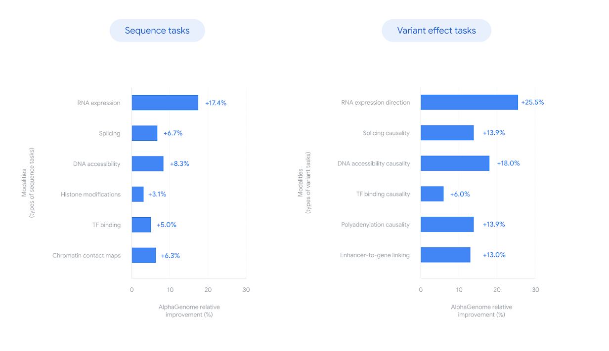 In nahezu allen standardisierten DNA-Aufgaben übertrifft AlphaGenome die bisherigen Modelle. Auch bei der Einschätzung genetischer Varianten zeigt es Bestwerte – und das bei deutlich weniger Trainingsaufwand. Das Modell wurde in nur vier Stunden auf TPUs trainiert und benötigt nur halb so viele Ressourcen wie vergleichbare Vorgänger.