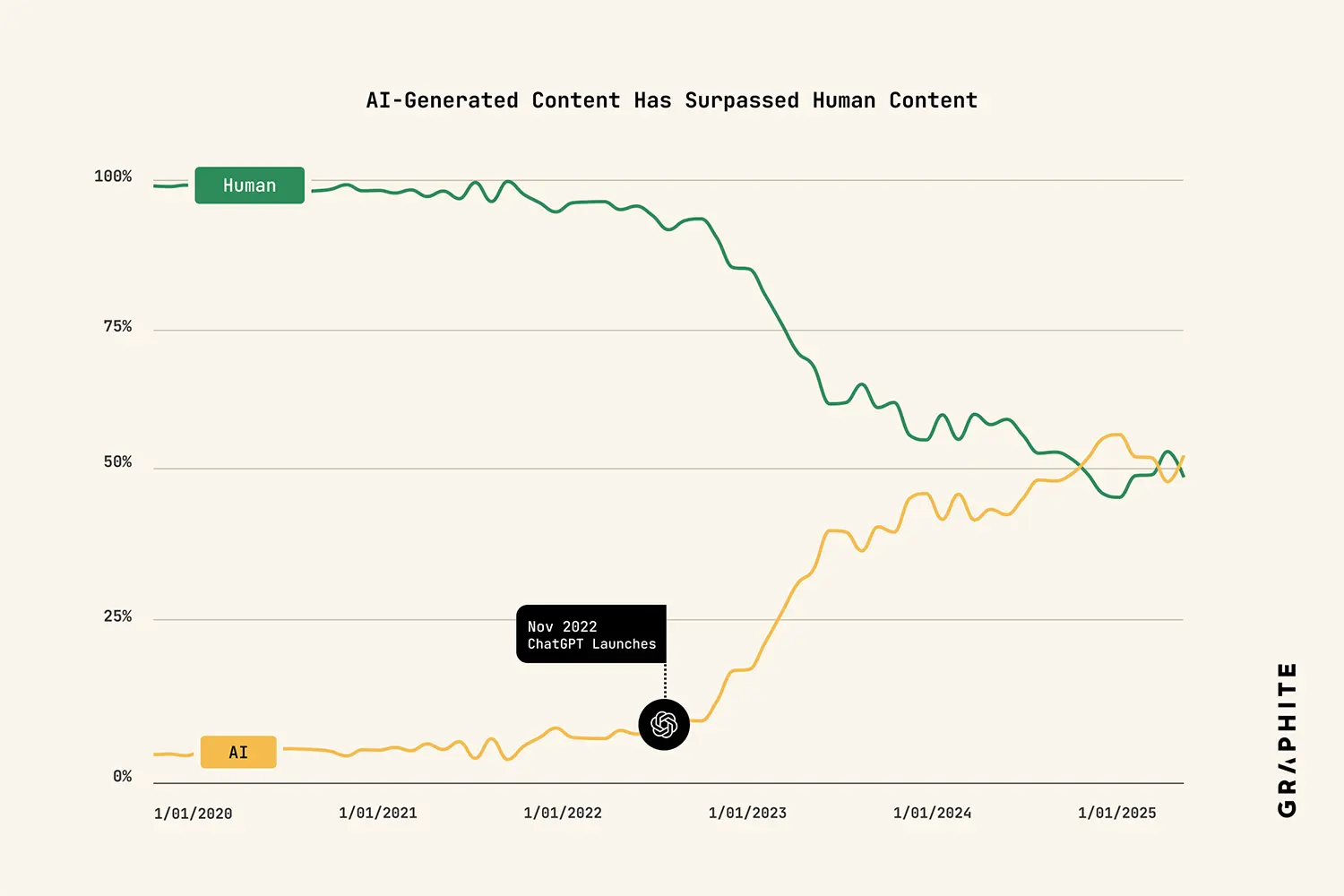 Der Aufstieg von KI-Tools wie ChatGPT hat die Inhaltsproduktion im Internet grundlegend verändert. Eine Analyse des SEO-Unternehmens Graphite belegt nun, dass seit November 2024 mehr als 50 Prozent aller neuen Webartikel von künstlicher Intelligenz verfasst werden. Dieser Meilenstein wurde in weniger als zwei Jahren nach der öffentlichen Einführung von ChatGPT erreicht.