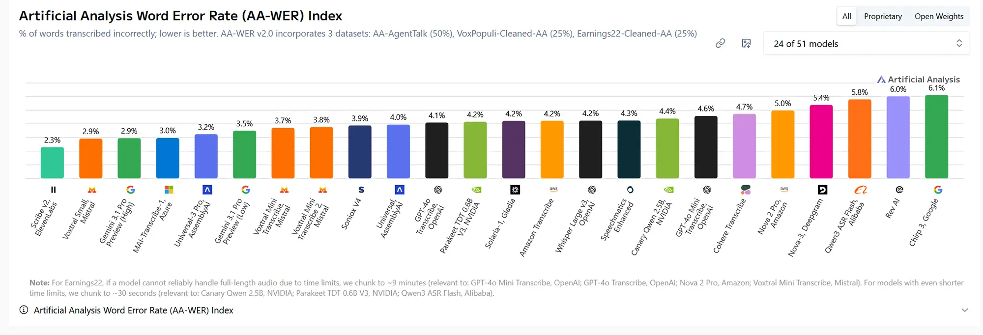 Quelle: Artificialanalysis - Scribe v2 Benchmark - Fehlerrate, weniger ist besser.