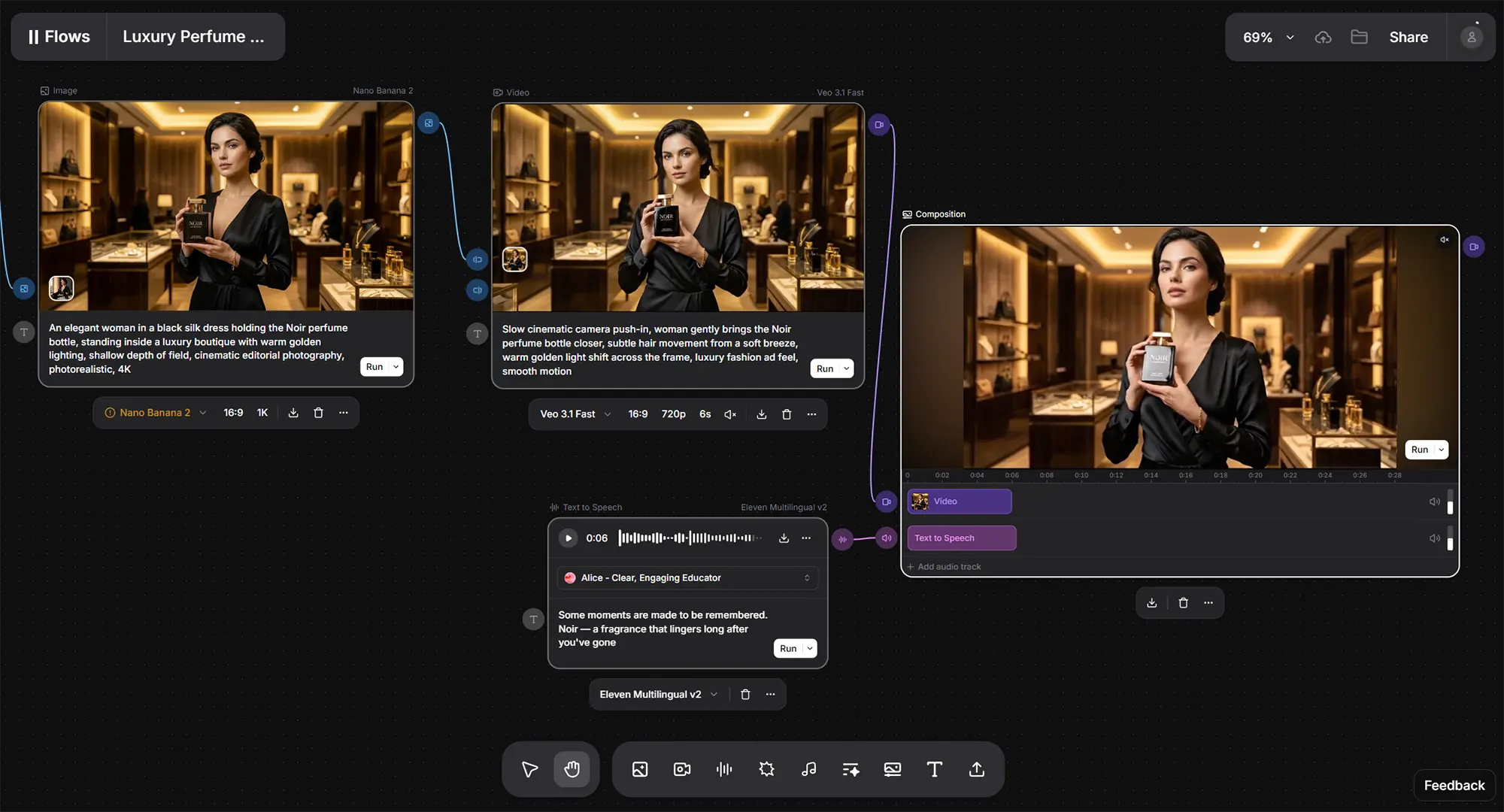 Der technische Aufbau erinnert dabei am ehesten an eine schlanke Version von ComfyUI. Anwender wählen zunächst die besten Bildgeneratoren und Videomodelle für ihr Projekt aus. Anschließend verknüpft man das visuelle Material direkt mit passender Musik und der Sprachsynthese von Elevenlabs. So integrieren Nutzer beispielsweise völlig unkompliziert ihre eigene geklonte Stimme in generierte Videoclips.