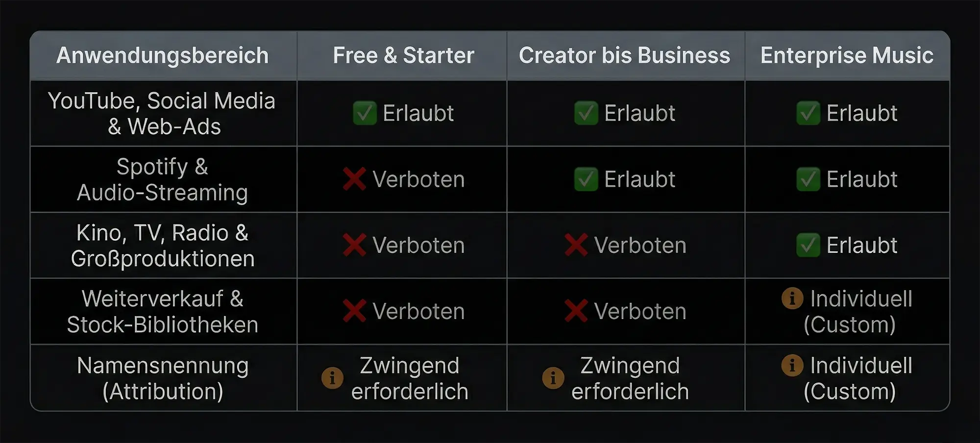 Grundsätzlich decken aber die kostenpflichtigen Tarife die meisten kommerziellen Online-Szenarien für gängige Social-Media-Kanäle sicher ab. Für den spezifischen Bereich der Musikgenerierung gelten mit Stand vom 3. April 2026 die folgenden Regelungen (ohne Gewähr):