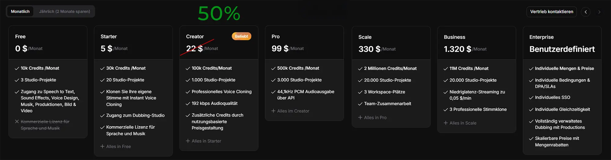 Dieses Abonnement stellt die populärste Wahl auf der Plattform dar. Neukunden profitieren im ersten Monat von einem einmaligen Rabatt in Höhe von 50 Prozent. Neben 100.000 Credits bietet der Tarif das Professional Voice Cloning. Diese Funktion liefert die aktuell wahrscheinlich besten und realistischsten Stimmklone auf dem gesamten Markt.