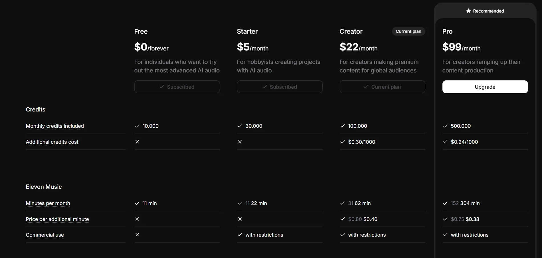 Im kostenlosen Plan kann man nur wenige Minuten pro Monat erstellen. Im 5-$-Starter-Plan sind es dann ca. 11 Minuten und ab dem Creator-Plan für 22 $ hat man über 30 Minuten. Im August 2025 gibt es zusätzlich 50 % Rabatt, sodass man anstelle von 30 Minuten sogar 60 Minuten erstellen kann. Da man auf den Creator-Plan auch noch 50 % Rabatt bekommt, kann man am Ende 60 Minuten Musik für 11 $ erstellen. Gerade am Anfang ist das ein guter Deal, um zu testen.