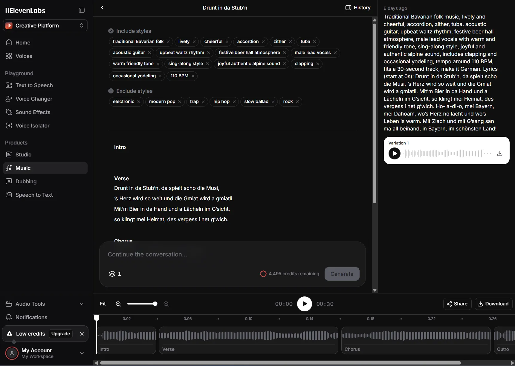 Nachdem wir alles eingestellt haben, sehen wir die Kosten in Form von Credits. Da es z. B. bei vier Varianten mit jeweils vier Minuten, also 16 Minuten Musik-Erstellung, schnell sehr teuer werden kann, empfehlen wir, zum Testen am Anfang immer eine Variante und 30 Sekunden auszuwählen. Anschließend klicken Sie auf „Generate”.